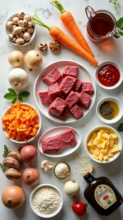 - Bake the Casserole Transfer everything into a casserole dish. Cover it with foil and bake for 45–50 minutes, until the beef becomes tender and the vegetables soften beautifully.